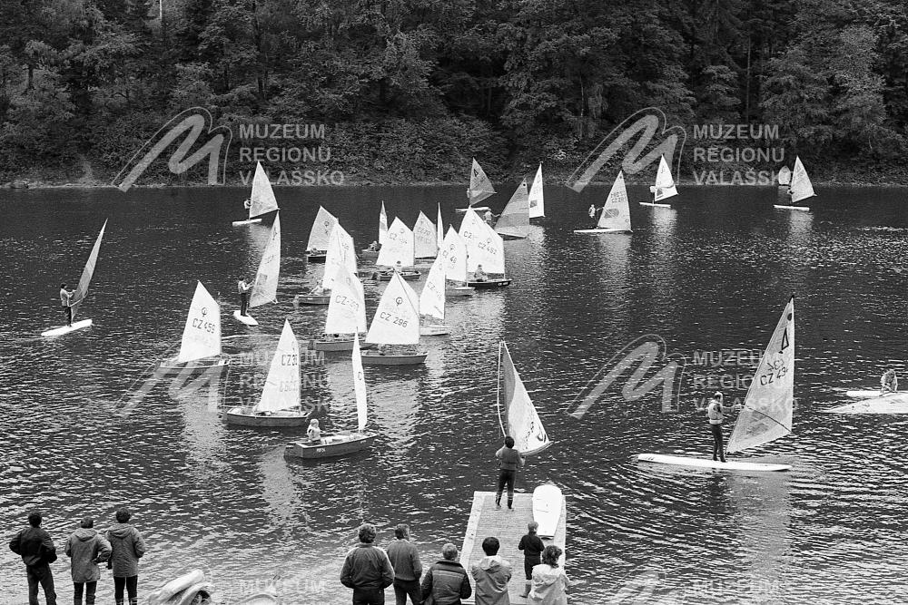 Obsah snímku: Lodě třídy Optimist a Windsurfing před startem