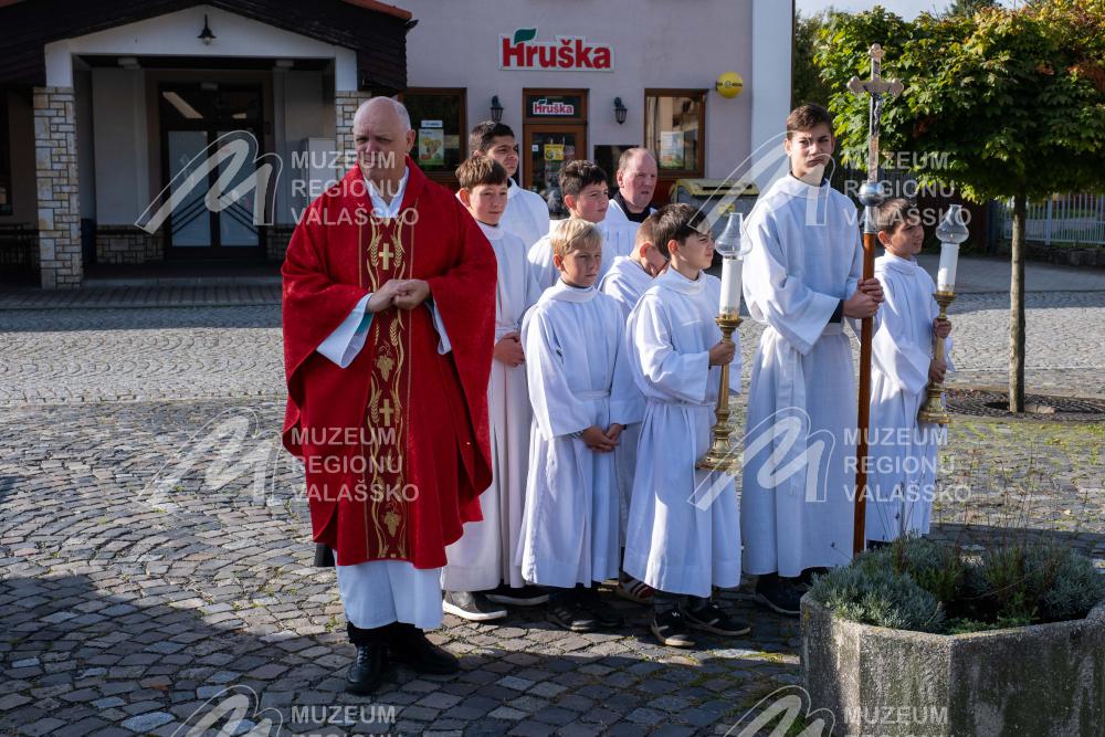 Obsah snímku: Dožinková slavnost ve vesnici Hovězí. Slavnstní mše svataá.