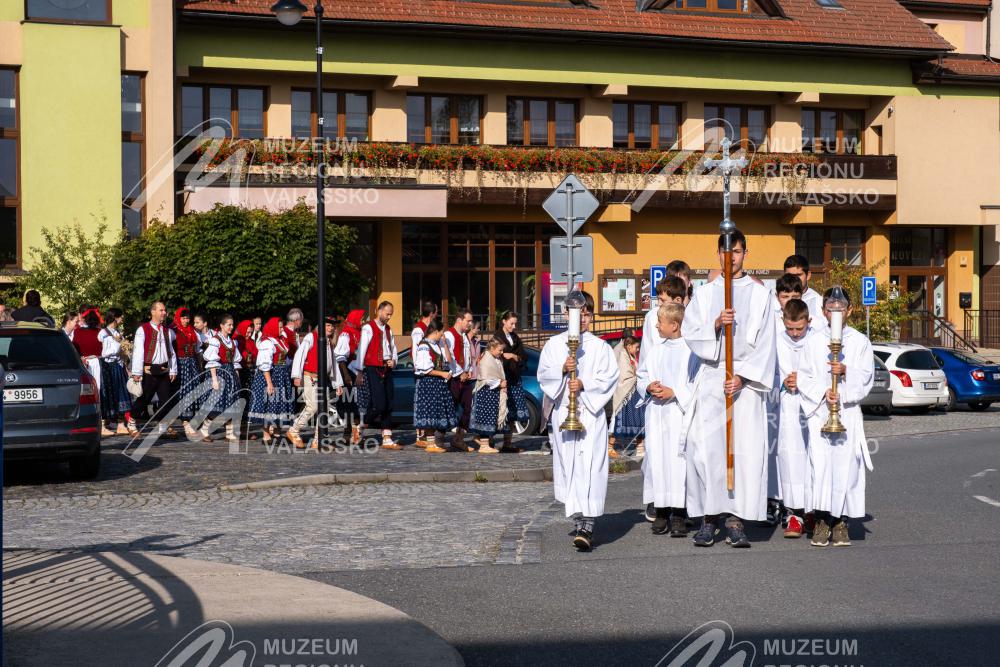 Obsah snímku: Dožinková slavnost ve vesnici Hovězí. Slavnstní mše svataá.