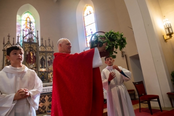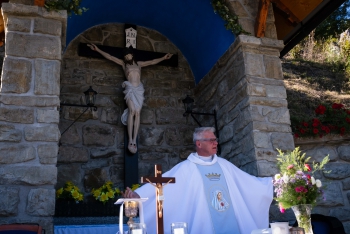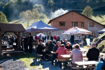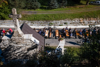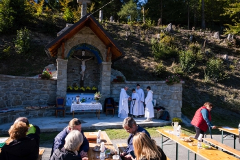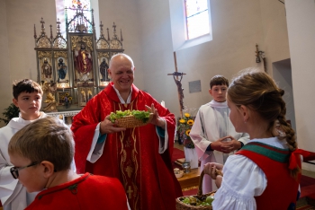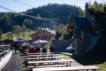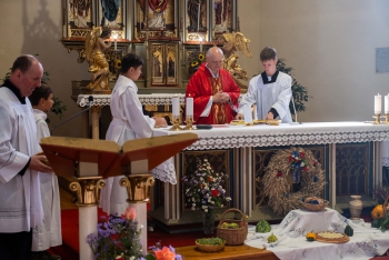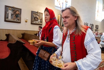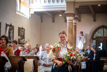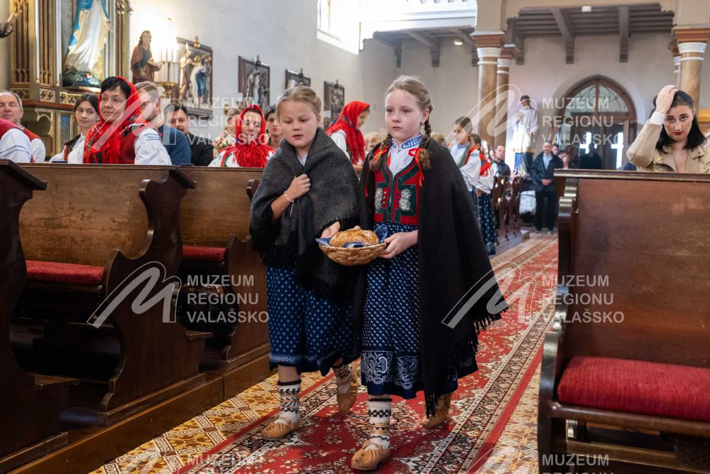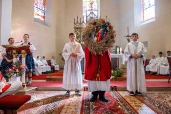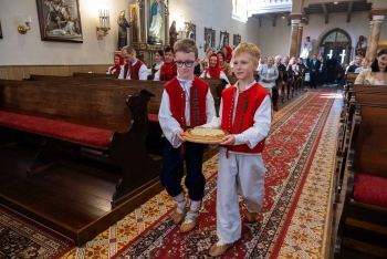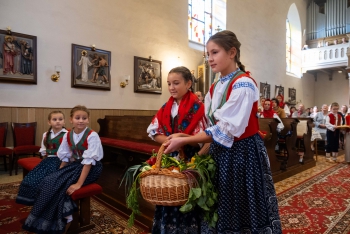 Obsah snímku: Dožinková slavnost ve vesnici Hovězí. Slavnstní mše svataá.