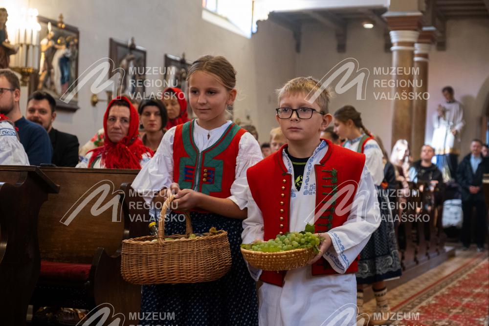 Obsah snímku: Dožinková slavnost ve vesnici Hovězí. Slavnstní mše svataá.