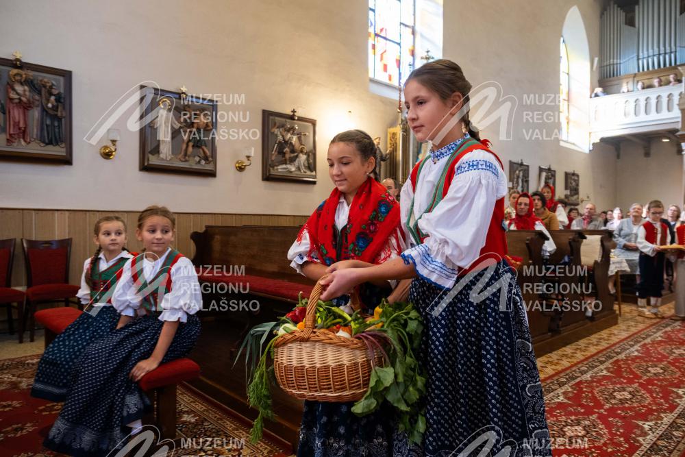 Obsah snímku: Dožinková slavnost ve vesnici Hovězí. Slavnstní mše svataá.
