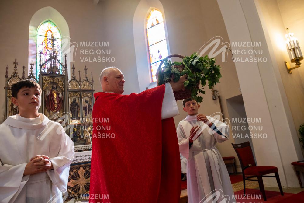 Obsah snímku: Dožinková slavnost ve vesnici Hovězí. Slavnstní mše svataá.