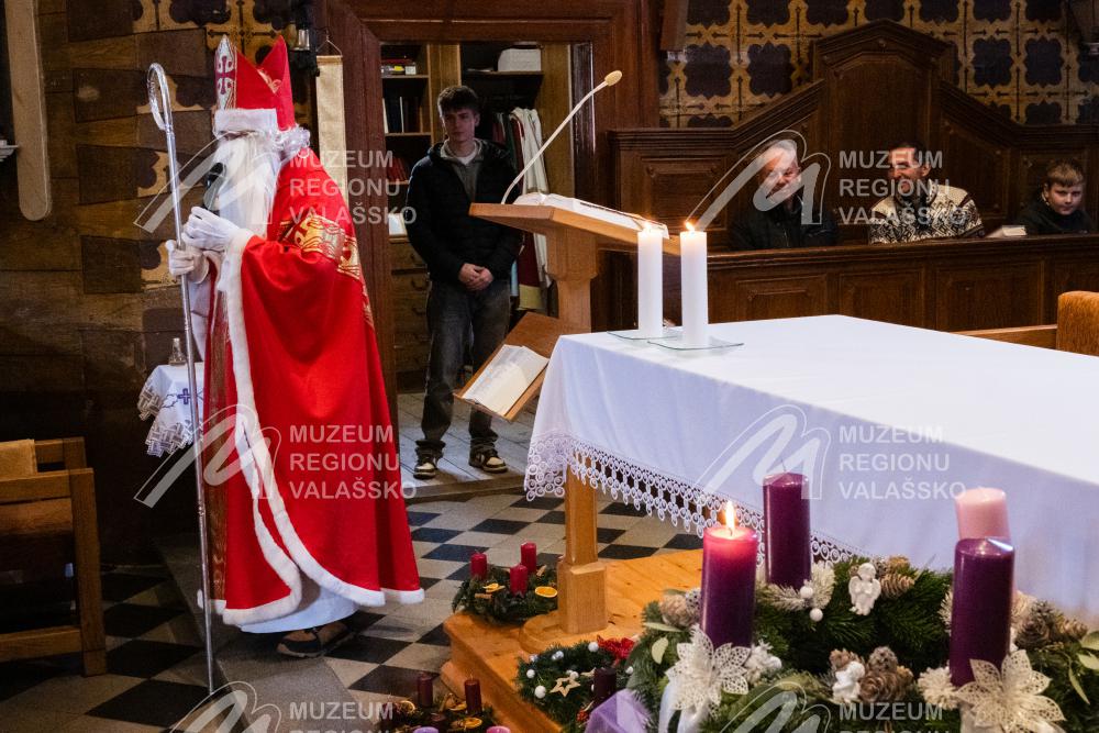Obsah snímku: Rozávání dárku Mikulášem dětem po mši svaté na 1.Adventní neděli