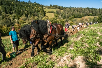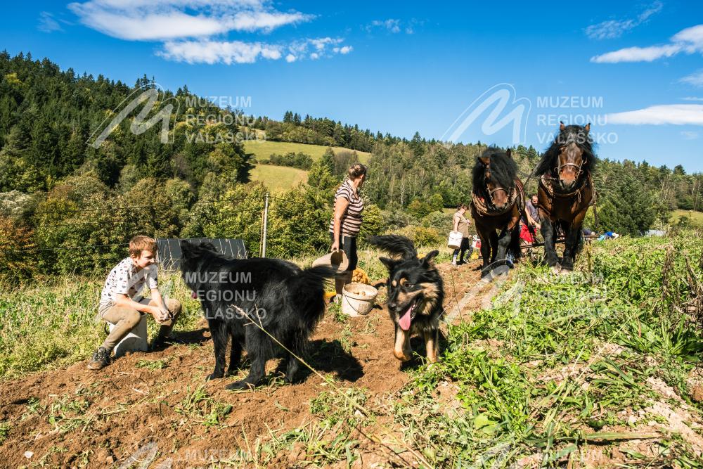 Obsah snímku: Vyorávání brambor koňským potahem, formanka Terka Vaculíková