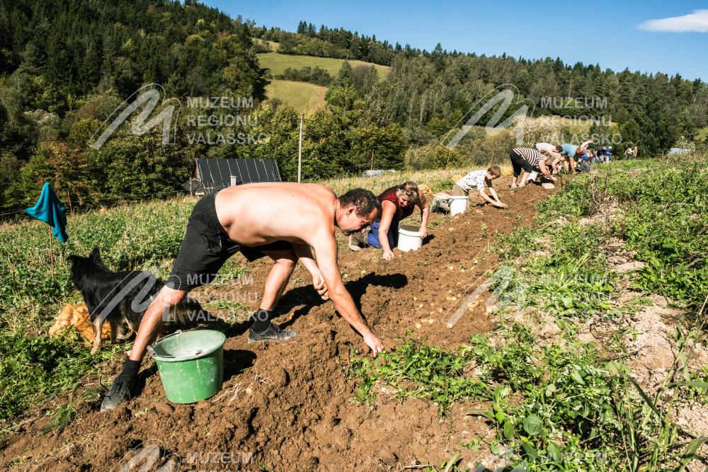 Obsah snímku: Vyorávání brambor koňským potahem, formanka Terka Vaculíková