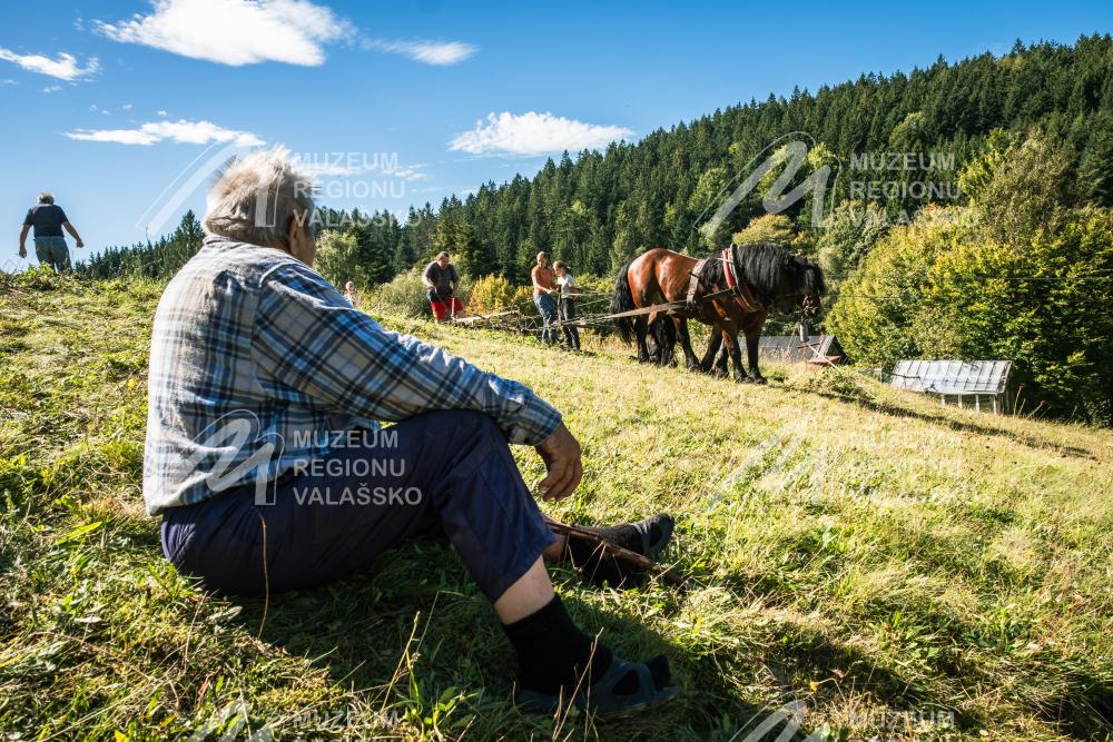 Obsah snímku: Vyorávání brambor koňským potahem, formanka Terka Vaculíková